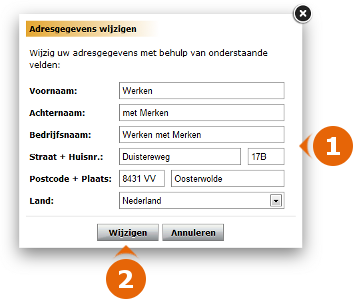 Gebruik de invoervelden in dit venster om uw adresgegevens te wijzigen en klik op de knop Wijzigen wanneer uw klaar bent. De volgende melding verschijnt: