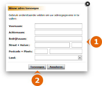 Klik op de knop Adres toevoegen onder het kopje 'Uw adressenboek'. Er verschijnt nu een nieuw venster met lege invoervelden: